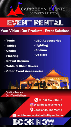 Caribbean Events & Services Limited is dedicated to providing all the equipment and services necessary to meet the needs of customers for a successful and memorable event. We rent and/or sell tents and their accesories. Our services include set up, take down & the maintenance of the products.